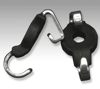 Kindkedjekrokar med platt baksida som gör att de är nypfria. Rostfritt stål med gummiklädnad.