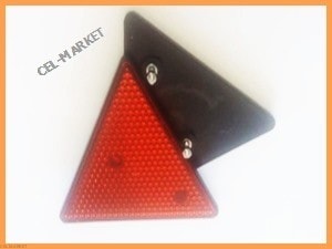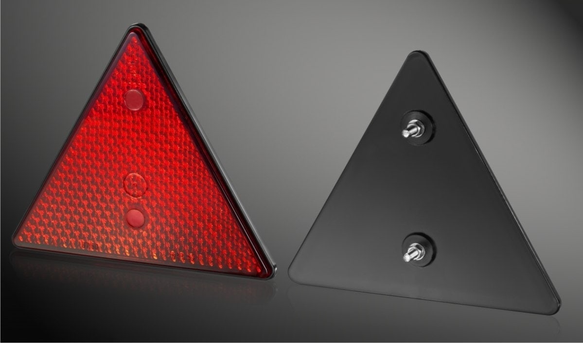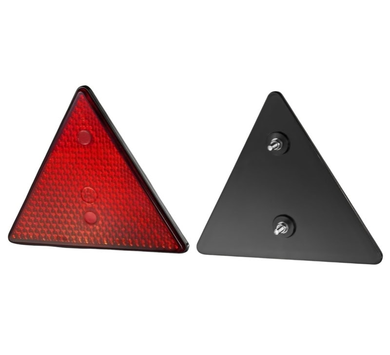 Röd triangelformad reflex som fästs med skruv på vagnen.